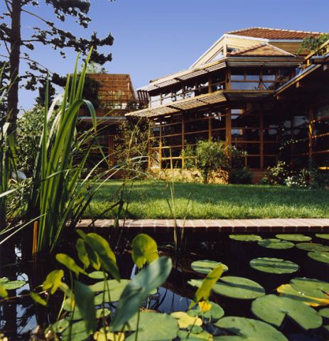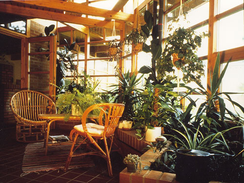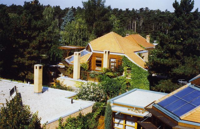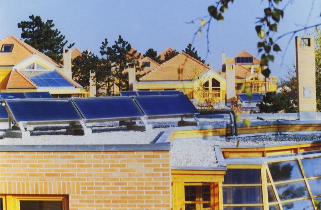 Die Orientierung der Wohnräume nach Süden bewirkt einerseits ein helles, freundliches Wohnklima und verbessert andererseits durch die großen Dachüberstände, die Wärmeschutzverglasung, die optimale, bei-nahe wärmebrückenfreien Wärmedämmung (AW 14cm, SD 20cm) und die Wintergärten eine deutliche Verringerung des Heizwärmebedarfes. Die Energieversorgung stützt sich auf Sonnenkollektoren für die Warmwasserbereitung und Gas-Brennwertthermen für die Raumheizung. Der Energiehaushalt ist jedoch nur ein Aspekt des ökologischen Konzeptes, das den Aufbau kleinräumiger, ökologischer Kreisläufe anstrebt.