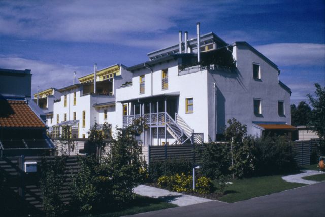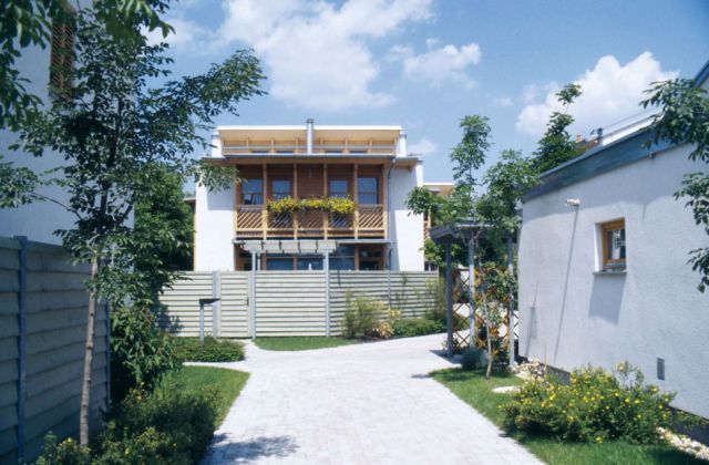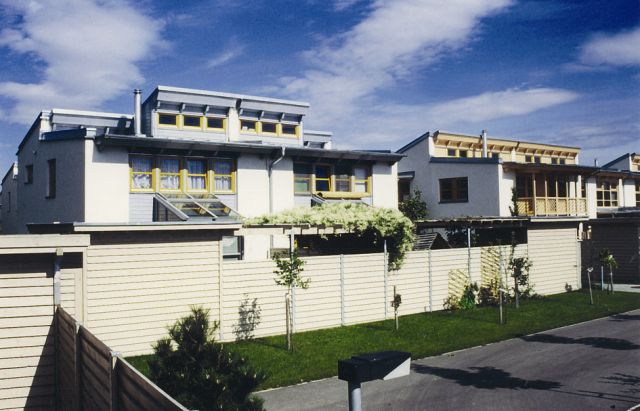 Die Häuser öffnen sich mit ihren Pultdächern zur Sonne, um ein Maximum an Wohnqualität zu erreichen. Die Flachdächer werden begrünt. Der Gartenhof ist die natürliche Erweiterung des Wohnraumes. Durch die konsequente Verwendung von geschlossenen Holzzäunen gelingt es, die Gärten vor unerwünschten Einblicken zu bewahren, und so ein Maximum an Privatsphäre in einem dicht verbauten Gebiet zu schaffen.