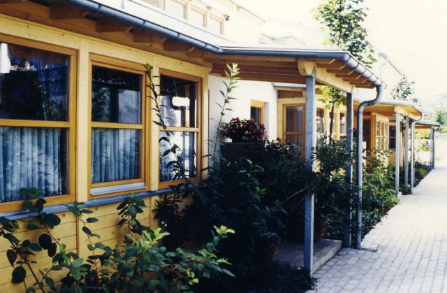 Die Erschließung der Siedlung erfolgt fußläufig, die PKW-Stellplätze befinden sich am Siedlungsrand, was vorallem für die Kinder in der Siedlung sehr wichtig ist. Bereits im ersten Bauabschnitt reicht das Wohnungsangebot von Singlewohnungen mit 50m² Wohnfläche und einer Dachterasse, über mittlere Reihen- und Atriumhäuser mit ca. 80 - 90m² Nutzfläche und eigenem Gartenhof, bis zu großen Reihenhäusern mit Einliegerwohnung. Alle Häuser haben einen eigenen Vorgarten auf der Nordseite, den Garten auf der Süd-seite, eine Pergola und einen eigenen Gartenschuppen. Auf die Unterkellerung wurde aufgrund der schwierigen Bodenverhältnisse großteils verzichtet.