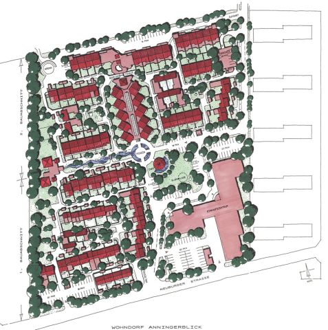 Geplant war die Errichtung von 130 Reihenhäusern und Wohnungen in verdichteter Flachbauweise. Ökologische und energetische Prinzipien sollten in einem Gesamtkonzept exemplarisch dargestellt werden. Das Gebiet wurde in drei Nachbarschaftseinheiten zu je ca. 43 Wohneinheiten geteilt, die jeweils über einen kleinen Gemeinschaftsplatz mit Spielmöglichkeiten verfügen. Das Zentrum bildet eine quadratische, von Bäumen eingefasste Piazza nach italienischem Vorbild. Ein Cafe sollte den imaginären Mittelpunkt der Anlage darstellen, und der sehr gemischten Struktur in diesem Ortsteil eine soziale Mitte geben. Außerdem ist ein Feuchtbiotop geplant, das sich von einer Quelle am Westrand bis zum Cafe erstreckt.