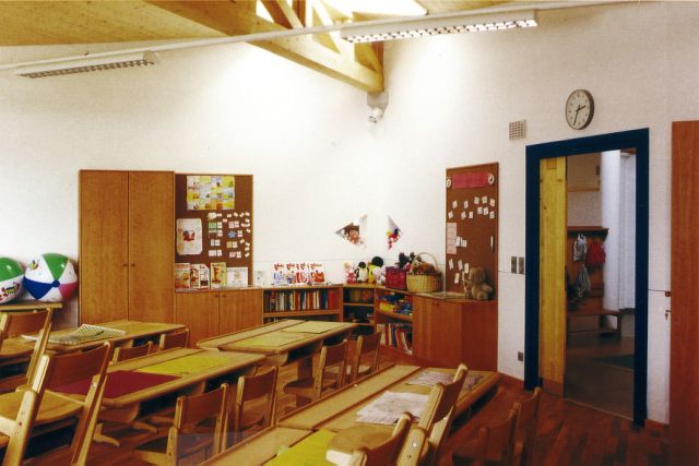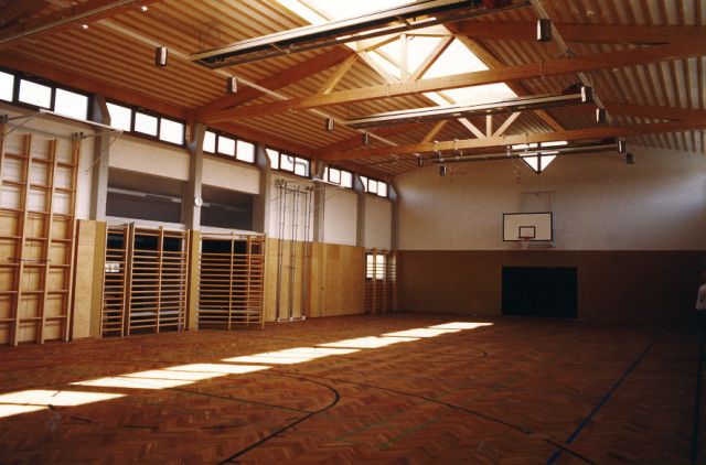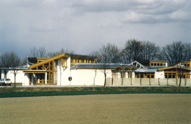 Intention der Gemeinde war eine gesunde und energiesparende Schule als Ausdruck des Verantwortungsgefühles für die kommenden Generationen. Dies schließt ein, daß in vielen Bereichen Holz zum Einsatz kommt (Deckenkonstruktion, Verkleidungen, Fußböden), das wiederverwertbar ist und auch nach langer Nutzungsdauer wenig von seiner Schönheit einbüßt. Auf PVC, Styropor und FCKW-hältige Materialien wurde vollständig verzichtet. Dampfdiffussionsfähige Konstruktionen (Hohlziegel mit 8cm Kork, Dächer hinterlüftet mit 20cm Zellulose) gewährleisten ein Feuchteklima ohne Kondensat- oder Schimmelgefahr. Mit Naturharzfarben gestrichene Wände und geölte Buchenböden erfordern zwar etwas mehr Pflege, bleiben dafür aber dauerhaft schön. Selbst im Turnsaal sind die Holzverkleidungen und der Holzschwingboden mit Naturharzöl behandelt. Selbstverständlich wurden auch für die Innenausstattung (Möbel, Tische und Stühle) geöltes Buchenvollholz verwendet.