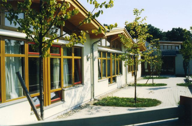 Der Schulhof ist zur Straße hin durch einen Holzzaun geschützt und wird, bis auf die Freiklassen und die Arena, als Wiese gestaltet. Auch hier wird es Bewegungsanreize und eine kindgerechte Atmosphäre geben. Die großzügige Aula bietet die Möglichkeit einer Abtrennung für spätere Nutzungen (Musizieren etc.), ohne das Gesamtkonzept zu stören. Ungewöhnlich ist, daß der Haupteingang nicht im Zentrum des Gebäudes, sondern jeweils ein Eingang mit wintergartenähnlichem Windfang an den beiden Traktenden liegt, und somit dem Besucher entgegen kommt. Die großzügig belichtete Turnhalle kann über den zweiten Eingang unabhängig vom Schulbetrieb genutzt werden. Um den Autoverkehr in diesem Bereich zu bremsen reicht die kreisrunde Pflasterung der beiden Vorplätze halb in den Straßenraum hinein.
