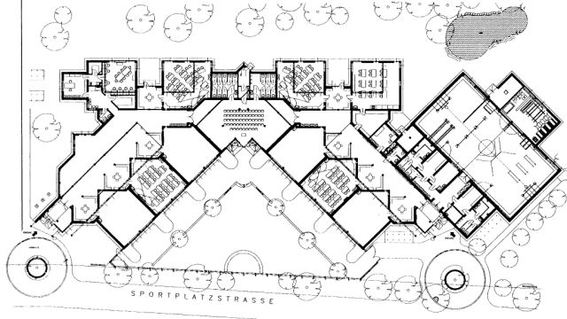 Da ausreichend Platz vorhanden war, konnte die Schule eingeschossig gebaut werden, was wesentliche Vorteile für Belichtung, Lüftung und Orientierung hat. Die differenzierte Baukörperstruktur mit Flachdächern und ziegelgedeckten Pultdächern nimmt auf den Maßstab der Umgebung Rücksicht. Das Farbleitsystem beruht auf den vier Farben Rot, Grün, Blau und Weiß, die bei Tür- und Fensterrahmen als Wegweiser eingesetzt werden.