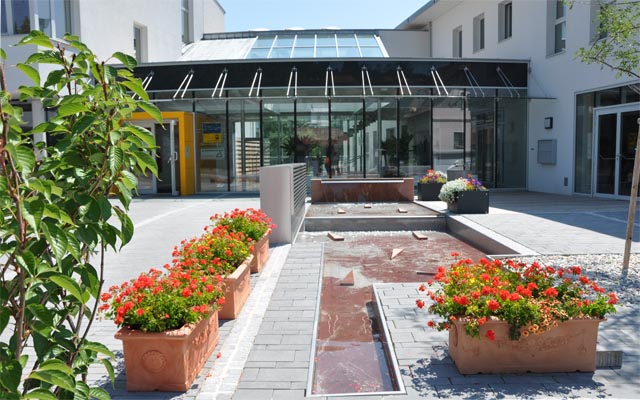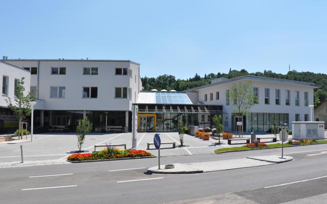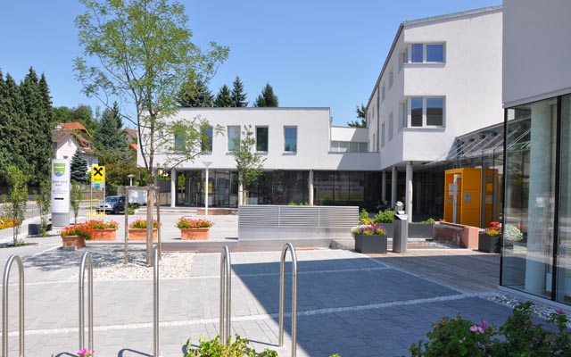 Das städtebauliche Konzept des Ortszentrums sieht einen attraktiven Dorfplatz mit Brunnen vor, in dem sich die Baulichkeiten des Gemeindeamtes mit Sitzungssaal, Foyer als Kommunikationsbereich sowie Bank, Geschäftsräumlichkeiten und Ärztezentrum gruppieren.