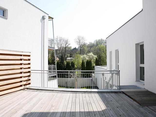 Vom Platz abgewandt, vorwiegend mit Orientierung nach Süden, wurden 13 Wohnungen errichtet. Teilweise mit Atrium-Wintergärten oder Terrassen mit direktem Blick auf den Wienfluss. Im Untergeschoß sind 5 Betreute Wohnungen mit Gemeinschaftsräumen und Eigengärten angeordnet. Vom Foyer zugänglich befinden sich im Obergeschoß 3 Arztordinationen.