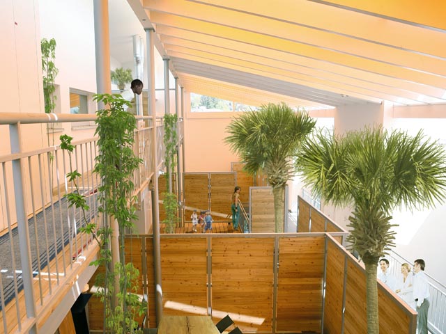 Das Gebäude hat ein Zweikreis-Wassersystem und das Nutzwasser (Regen- und Brunnenwasser) wird für die WC-Spülung und Bewässerung der Anlage verwendet. Die Baustoffe wurden nach den Prüfkriterien des Instituts für Baubiologie und -ökologie ausgewählt und entsprechen in baubiologischer sowie ökologischer Sicht diesen Anforderungen.