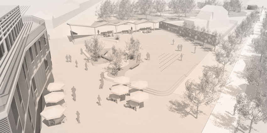 Im Bereich zur Hamerlingstrasse hin schliesst eine leichte Dachkonstruktion den Platz ab und bietet Platz für einen permanenten Wochenmarkt. Die Marktsituation lässt sich beliebig auf den gesamten Platz erweitern und ermöglicht somit ein breit gefächertes Angebot, vom Christkindlmarkt über das Spargelfest oder wöchentlichen Bauernmärkten aber auch Musik- und Sportevents oder temporäres Eislaufen im Winter.