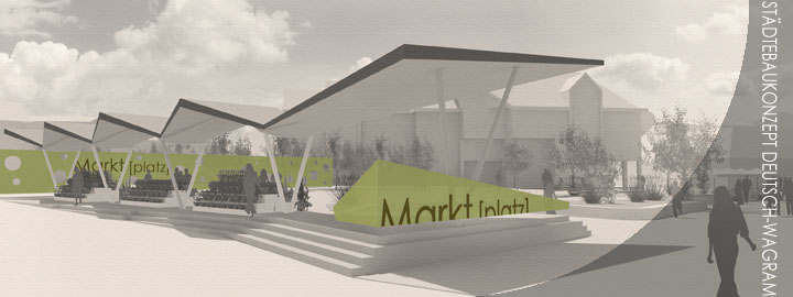 DEUTSCH WAGRAM: Der bestehende Marktplatz bei der Musikschule soll teilweise verbaut werden. Damit ergibt sich städtebaulich eine zusammenhängende Bebauungsstruktur mit einem Abschluss von der Friedhofalle bis zur Erbachstrasse, welche in Zukunft als erweiterter Teil einer Einkaufsstrasse fungieren kann. Das bestehende, stark baufällige Markplatzgebäude soll abgebrochen und ein neuer Marktplatz gestaltet werden.