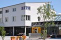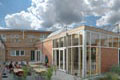 sieht eine zentrale Erschließung vor, von der aus sich die einzelnen Bauteile sternförmig auffächern. Das Zentrum bilden die Gemeinschaftseinrichtungen mit Speise- Veranstaltungssaal, Küche und Sanitärgruppe. Die Erschließung erfolgt über zentrale glasgedeckte Gänge (teilweise mit Balkonen überdacht), die Raum für Kommunikation und Begegnung bieten.