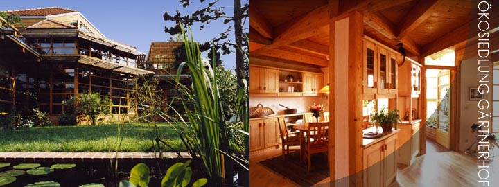Die Orientierung der Wohnräume nach Süden bewirkt einerseits ein helles, freundliches Wohnklima und verbessert andererseits durch die großen Dachüberstände, die Wärmeschutzverglasung, die optimale, bei-nahe wärmebrückenfreien Wärmedämmung (AW 14cm, SD 20cm) und die Wintergärten eine deutliche Verringerung des Heizwärmebedarfes. Die Energieversorgung stützt sich auf Sonnenkollektoren für die Warmwasserbereitung und Gas-Brennwertthermen für die Raumheizung. Der Energiehaushalt ist jedoch nur ein Aspekt des ökologischen Konzeptes, das den Aufbau kleinräumiger, ökologischer Kreisläufe anstrebt.