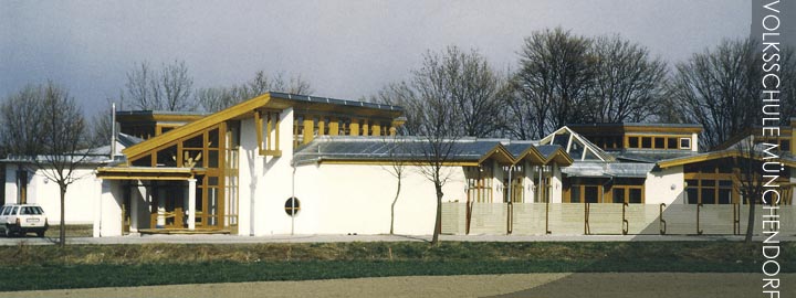 Der Neubau ersetzt die alte Volksschule im Ortszentrum und enthält 7 Klassen, Werkraum, Hortraum, Turnsaal 12 x 24m, Direktion und Nebenräume. Grundlage der Planung war die Verbindung der Aspekte der modernen Schulpädagogik mit den Erkenntnissen der ökologisch orientierten Architektur. Die Grundrißform der einzelnen Klassen, mit ihrer charakteristischen Eckform ermöglicht die so wichtige Gruppenarbeit (Spielecke, Basteltisch). Die Garderoben wurden den einzelnen Klassen zugeordnet und mit einem kleinen Tisch ausgestattet, und können daher auch für Gruppenarbeiten während des Unterrichts genutzt werden.